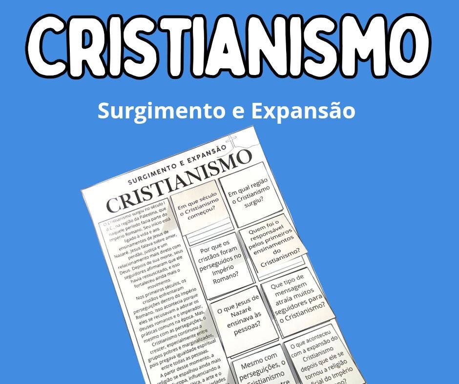 O material traz um texto didático sobre o surgimento e a expansão do Cristianismo, acompanhado de oito cartões de perguntas que os alunos devem colar nos espaços correspondentes da folha principal.