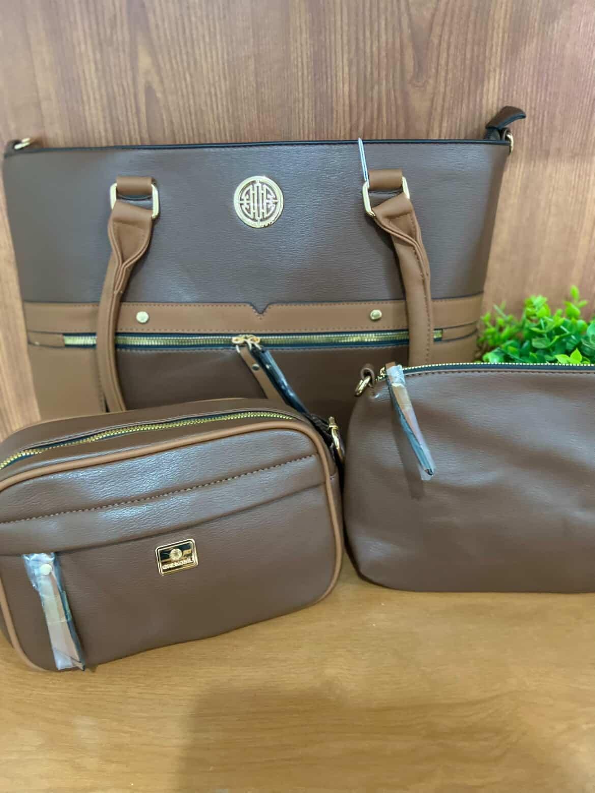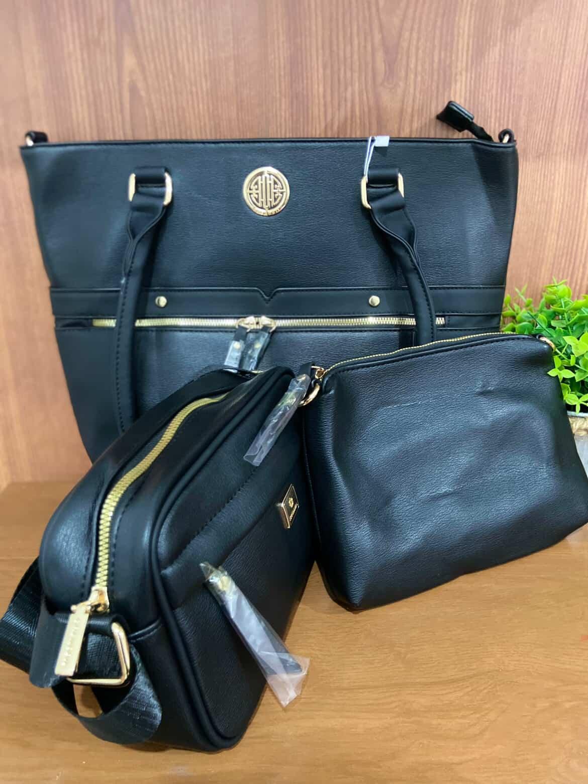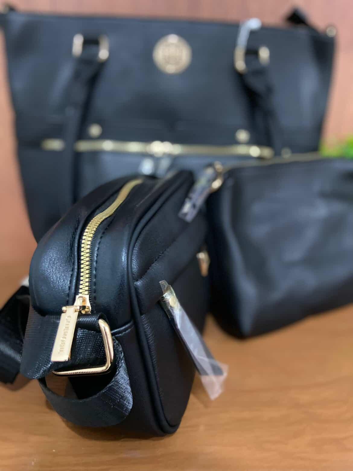 Conjunto com 3 bolsas em material sintético de alta qualidade, acabamento moderno e detalhes em metal dourado. Acompanha: