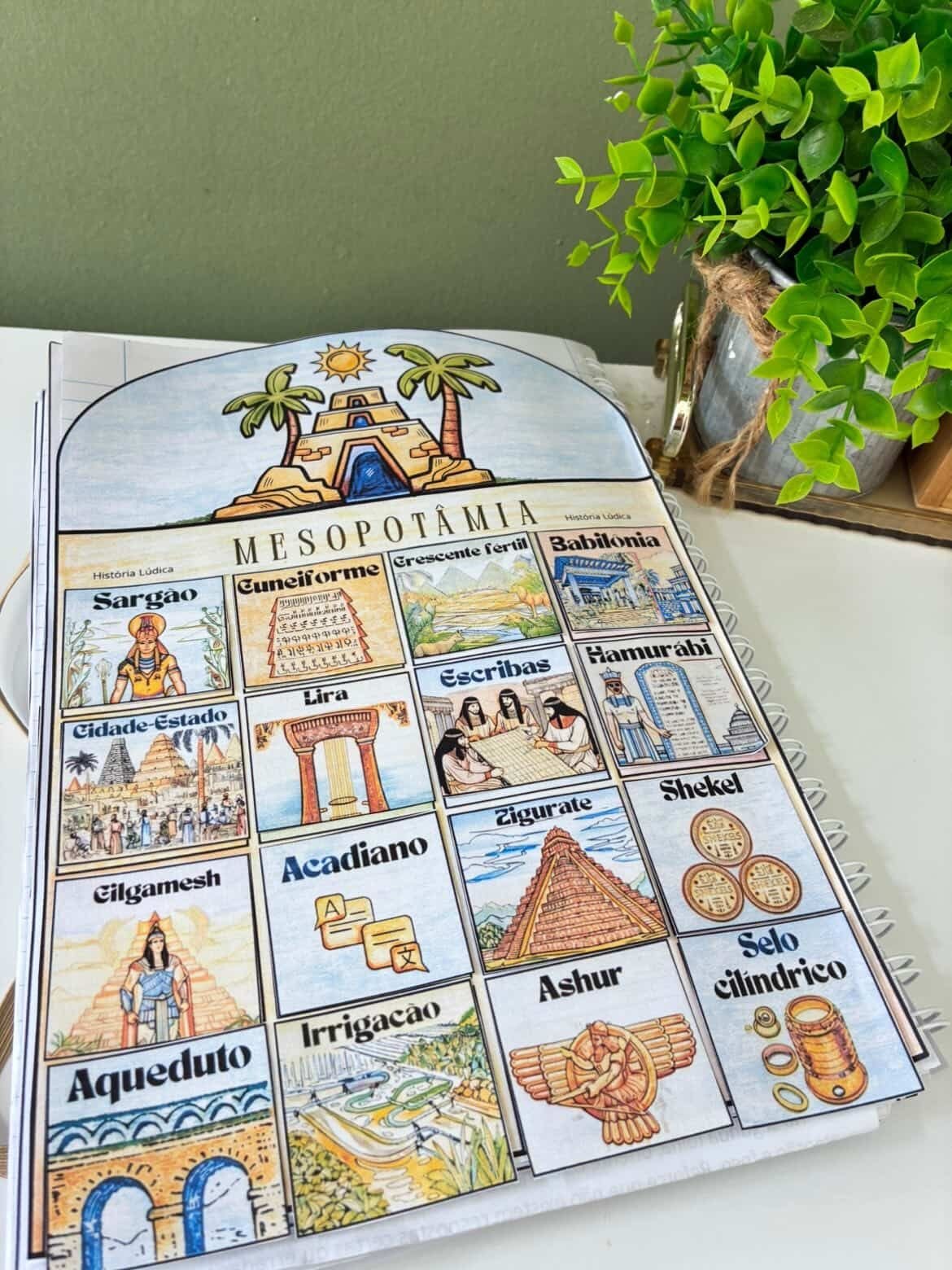 Um vocabulário Interativo com várias características da civilização mesopotâmica com imagens para colorir.